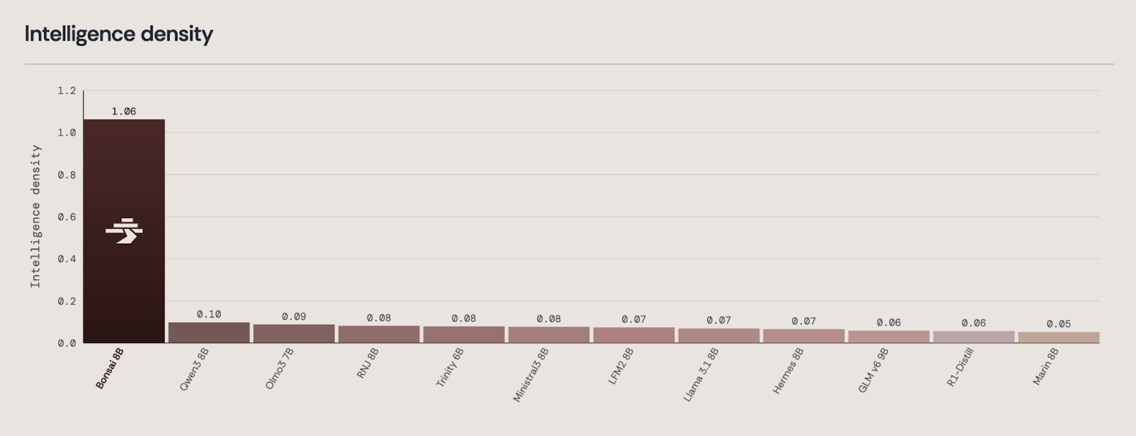 PrismML’s chart illustrating “intelligence density” for Bonsai 8B